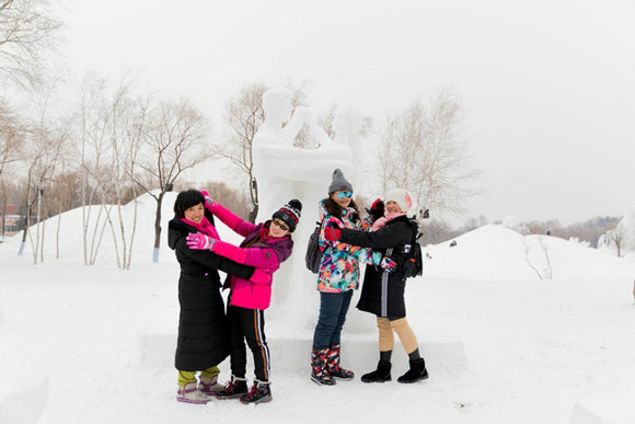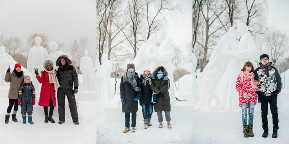 有些情侣效仿身后的雪雕,或紧紧相拥,或甜蜜亲吻,在镜头前大肆秀了一把恩爱。有些全家出动的游客,则在苍茫一片中拍摄了一张意义非凡的全家福。