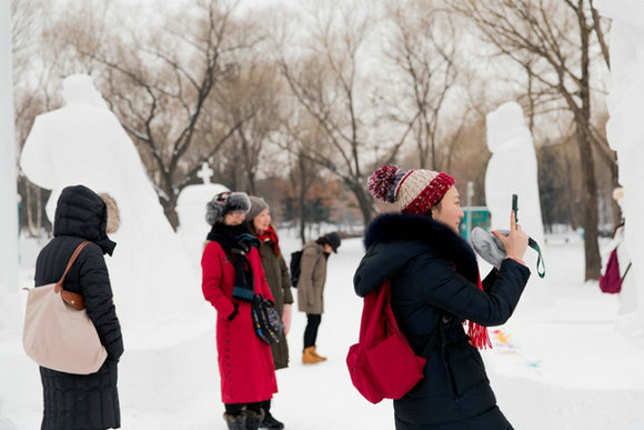 爱情雪雕引来游客流连忘返 奇妙爱情岛现已正式开放,每天都有很多游客在奇妙爱情岛上游览。看见这些技艺精湛的雪雕,游客们纷纷拿出手机合影留念。