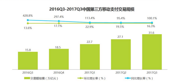 近日,艾瑞咨询发布了2017年第三季度中国第三方支付数据报告。据报告显示,中国第三方移动支付交易规模达31.6万亿元,同比增长100.1%,环比增长16.3%;中国第三方互联网支付交易规模达7.4万亿元,同比增长42.3%,环比增长4.2%。在支付宝、财付通领跑行业的背景下,苏宁金融再次交出了亮眼的成绩单,移动支付、互联网支付双双发力,稳居行业前列。