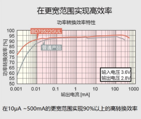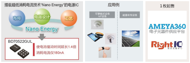 <概要> 全球知名半导体制造商ROHM面向移动设备、可穿戴式设备及IoT设备等电池驱动的电子设备,开发出实现世界最小消耗电流的内置MOSFET的降压型DC/DC转换器*1)“BD70522GUL”。 “BD70522GUL”是旨在实现IoT领域的关键词“纽扣电池10年驱动”开发而成的超低功耗电源IC。在ROHM的垂直统合型生产体制下,利用凝聚“电路设计”、“布局”、“工艺”三大尖端模拟技术优势而独创的Nano Energy技术,实现了世界最小的消耗电流180nA(n为10的负9次幂)。这使无负载时(应用待机时)的电池驱动时间比普通产品长1.4倍※,有助于CR2025等纽扣电池驱动的电子设备更长时间运行。此外,在业界最宽范围(10μA~500mA,从轻负载到最大负载)实现90%以上的功率转换效率。 本产品已于2017年10月开始出售样品(样品价格300日元/个:不含税),并计划于2018年3月起暂以月产100万个的规模投入量产。前期工序的生产基地为ROHM滨松株式会社(日本滨松市),后期工序的生产基地为ROHM Apollo Co.,Ltd.(日本行桥市)。另外,本新闻发布的同时,还将同步开始本产品“BD70522GUL”和搭载本产品的评估板“BD70522GUL-EVK-101”的网售,用户可从AMEYA360和Right IC两家网售平台购买。 今后,ROHM将继续开发运用模拟技术优势的高性能、高可靠性产品,为全社会的节能贡献力量。 <背景> 近年来,智能手机等移动设备、可穿戴式设备及IoT设备等用电池驱动的电子设备迅速普及。而且,为了提高产品的设计灵活度并确保配置新功能所用的空间,要求这些产品上搭载的元器件的功耗要降低到极限,以实现小型化并延长电池使用寿命。 一直以来,ROHM运用模拟设计技术和电源系统的工艺技术优势,并发挥垂直统合型生产体制的优势,致力于开发满足市场需求的电源IC。此次再次发挥这些优势,开发出搭载超低消耗电流技术“Nano Energy”的电源IC。 <特点详情> 新产品“BD70522GUL”是以IoT市场的关键词“纽扣电池10年驱动”为目标开发而成的超低功耗降压型电源IC。产品具备以下特点,非常有助于搭载蓄电池和小型电池的设备长时间驱动。 1.利用Nano Energy技术,实现世界最小的消耗电流180nA 利用凝聚新开发的独有控制电路、电源IC的最佳模拟元件布局、电源系统工艺0.35μm的BiCDMOS等ROHM在低消耗电流方面的模拟技术优势而诞生的超低消耗电流技术“Nano Energy”,实现了世界最小的消耗电流180nA。 实现世界最低消耗电流使得在诸如无负载时(应用待机时)的电池驱动时间比普通产品延长1.4倍。(ROHM调查数据) 2.在更宽的负载电流范围实现高效率 内置低损耗MOSFET,负载模式搭载根据负载电流自动无缝切换的Seamless Switching Mode Control(SSMC)功能,在消耗电流1μA以下的DC/DC转换器中,在业界最宽范围(10μA~500mA)实现90%以上的功率转换效率。 在众多电子设备和应用的不同状态下实现高效率的功率转换,有助于延长电池的驱动时间。 <关于Nano Energy技术> Nano Energy是在ROHM的垂直统合型生产体制下,融合“电路设计”、“布局”、“工艺”三大尖端模拟技术优势实现的超低消耗电流技术。有助于移动设备、可穿戴式设备及IoT设备等用蓄电池或小型电池驱动的电子设备的长时间驱动。 <应用例> ・可穿戴式设备、移动设备 ・电池驱动的IoT设备(传感器节点)、小型工业设备(报警器、警报设备、电子货架标签等)
