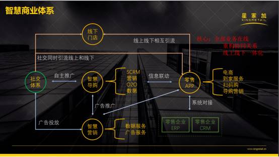 星家加总裁刘凯现场讲话 星家加推动智慧零售全面落地的能力体现在三大方面: 一.系统的智慧零售解决方案 星家加以全部业务在线、重构协同关系和线上线下一体化为核心,搭建起了较为全面的智慧商业体系。该体系以线下门店、线上零售APP、智慧导购和智慧营销为主要切入点,导入社交体系,对接ERP和CRM系统,并通过到家服务、扫码购物、导购营销等方式更进一步地连接起线上和线下。