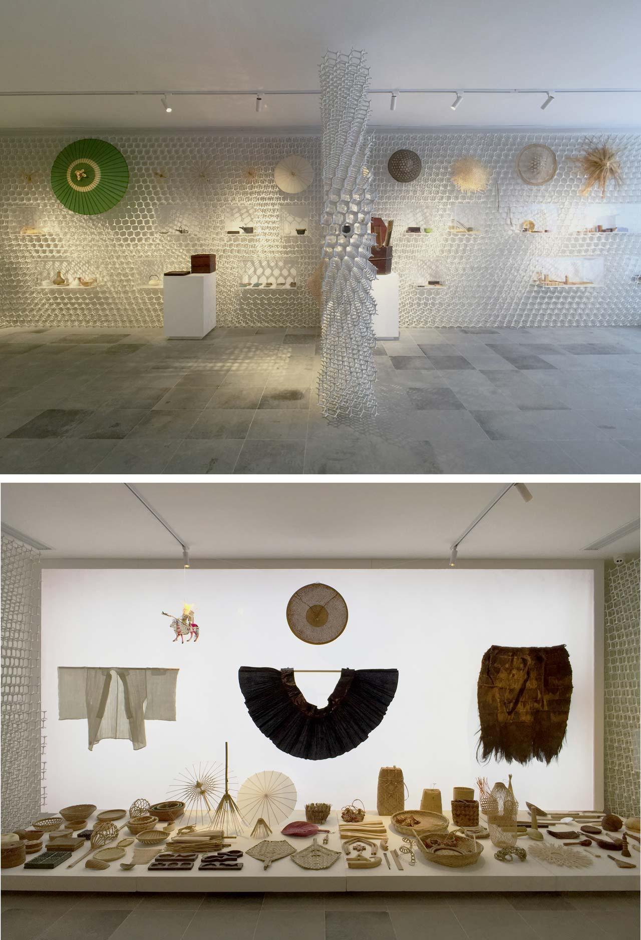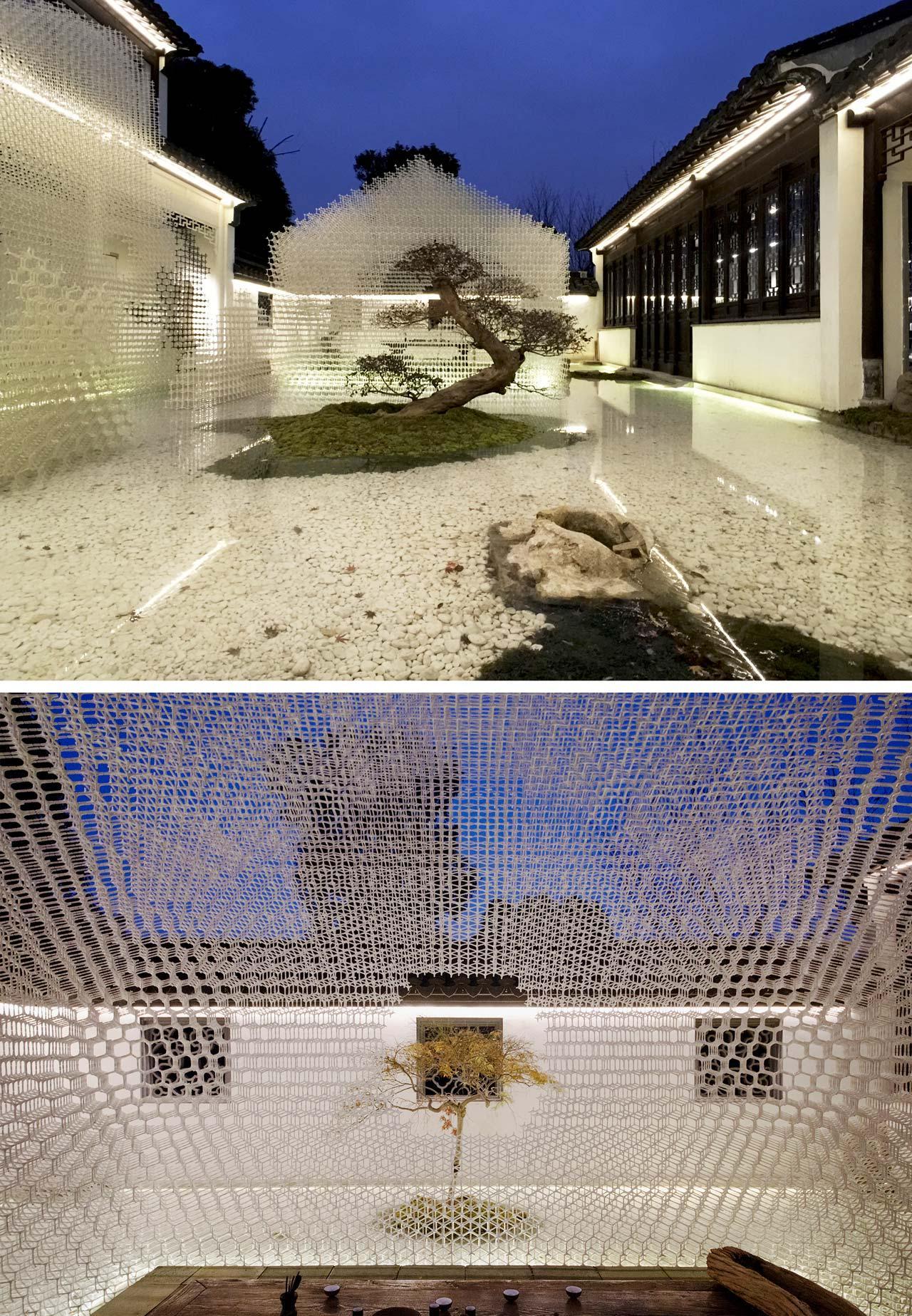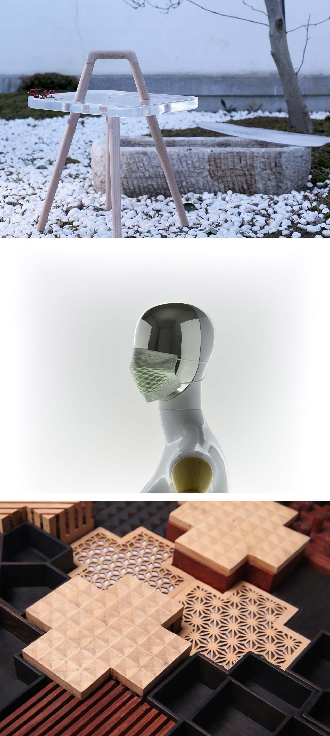 一座超现实主义的“虚山水”庭院 博物馆空间在一座传统的苏州园林基础上进行改造,分为室内展馆与室外庭院展区两个部分。室内展馆采用白色Y形支架系统作为整个博物馆展览道具,未来感、虚拟化的现代材质反衬出手工造物产品与材料真实而强烈的质感 这种强烈的对比从室内展厅一直延续到了室外庭院展区,同样采Y形支架系统取代了中国传统园林中的假山石和花窗的部分,依照苏州园林“移步借景”的造园法则,结合真实的园林连廊、水景青苔、古井红枫,由此诞生了一座超现实主义的“虚山水”庭院。人文主义与数字文明在此刻完美交融。