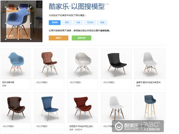 AI:让未来设计实现设计未来 从过去到未来,设计一直是家居行业的入口,设计师的使命与压力不言而喻,无论是一键匹配样板间,还是橱柜智能布局,酷家乐一直致力于AI技术与算法的研发,为设计师松绑减负,让设计师拥有更多时间去捕捉灵感与创意。 现实生活中,业主或者设计师浏览到自己心仪的家具,一旦参与设计,要从千万模型库中搜寻到它,无异于大海捞针。酷家乐全球独创的“以图搜模型”产品,正是针对家居业务流程中“所见而不可得”的痛点,借助AI技术的又一次功能创新。