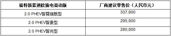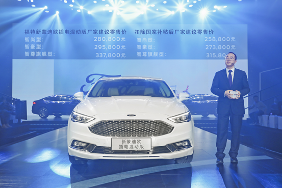 · 福特新蒙迪欧插电混动版正式上市,全系共推出3款车型,供消费者选择。 · 福特新蒙迪欧插电混动版采用福特先进电气化技术,整车百公里综合工况油耗低至2.0升,纯电动续驶里程达52公里,充电时间2.5-5小时。除随车的便携式充电枪,还为消费者免费提供并安装家用充电桩。 · 福特新蒙迪欧插电混动版搭载全新升级的福特派互联,新增无线热点功能,带来更加智能便捷的用车体验。 · 福特新蒙迪欧插电混动版的整车质保周期为3年或10万公里,新能源专用零件质保周期为8年或16万公里。 · 福特新蒙迪欧插电混动版已入选《新能源汽车推广应用推荐车型目录》,2018年消费者购车即可享受国家补贴。 · 福特新蒙迪欧插电混动版售价区间为280,800元至337,800元。