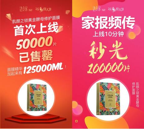 Color Lock黄金酵母修护面膜于达令家本月佳人节(4月26日)限量测试上线,仅仅5分钟5000盒售罄,10分钟10000盒售罄。从这一张华丽的成绩单中,可以看出市场对达令家小金锁的饥渴,更是达令家店主对达令家小金锁的认可。