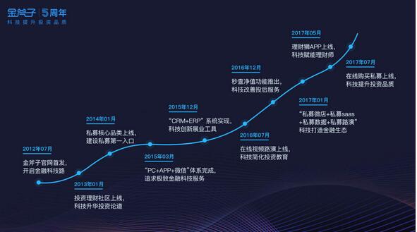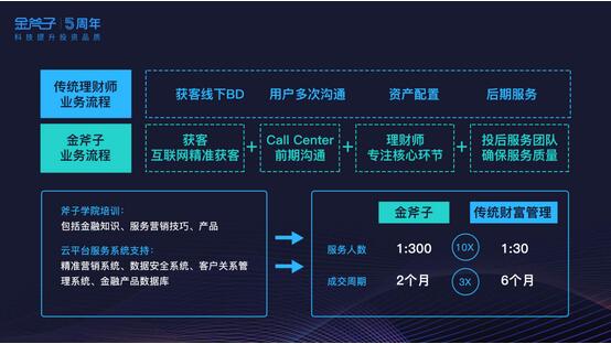 (图3:近两年私募基金备案登记情况) 在为高净值用户打造创新、极致的财富管理服务体验上金斧子可谓遥遥领先。首创2017年1月全国私募大会,吸引500多家优秀私募机构出席,被喻为私募行业“网商大会”。涵盖PC网站、微信、APP、直播视频的全方位、立体的财富管理信息化、数据化入口,为即时、高效的理财服务提供强大技术支撑,客户可体验搜索比价、净值查询、全行业财富记账和线上线下相结合的路演服务。推出“私募微店”服务,运用“互联网+”、金融科技赋能私募行业,为私募机构提供全套触网解决方案。近期进一步推出大数据API接口通道接入,以大数据商业智能为核心,链接数字生态平台与自动化投放的智能营销、智能投顾、智能客服全套私募中后台智能管理系统“私募云管家”。 六重科技赋能,打造“卓越理财师千人计划” 纯互联网轻服务的模式已经隐现天花板,要服务好投资门槛100万元起的高净值客户,高素质的专业理财师队伍不可或缺。 2017年,金斧子宣布启动“卓越理财师千人计划”,将人才战略升级为“以理财师为核心”,计划将现有的300人理财师队伍扩充至千人,且未来5年,年均至少每年投入1亿在卓越理财师客源、培训、供给、售后、IT支持系统的建设上。 金斧子笃信“科技提升投资品质”,用科技赋能理财师,使得后者的投入产出比和服务能效加倍成长。具体来说,金斧子的优势在于:1、精准获取高净值客源,释放理财师的生产力;2、网站、微信、APP等行为分析,贴身了解客户最新动态;3、实现在线私募交易,免掉繁琐的合同及信息认证服务;4、平台化打通全球投资品类,全方位解决客户多元化资产配置需求;5、智能投顾后台服务系统,产品净值、相关研报售后无忧;6、投资者教育视频数据平台,海量私募基金经理进行线上路演。 不难看出,在传统人工服务逐渐受到人工智能冲击的当下,理财师群体本身也亟需跟上时代步伐,而金斧子的六重科技赋能恰好为理财师提供了全新的发展通道。相比传统理财师的业务流程,90%的时间浪费在打陌生电话获客、前期沟通、售后处理工作上,金斧子理财师可以将几乎所有精力专注于核心的需求挖掘、资产配置、深度关系环节,单个理财师服务的客户资产规模提升10倍,而便捷的在线交易系统大幅优化了销售流程,促成交易的平均时间缩短了2/3。在金斧子现有理财师队伍中,有不少来自券商、银行、保险的传统理财师,他们服务高净值用户的数量巨增,同时还可以更加深入挖掘高净值客户更高层次的资产配置需求,最后个人收入也可望从40万突破100万以上。