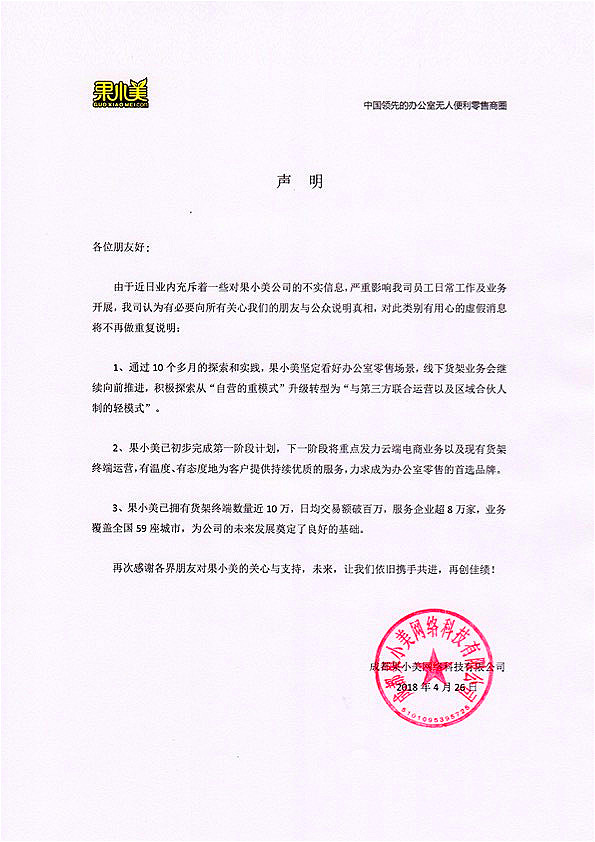 近日,相关人士爆料果小美在北京的一处指定仓库被供应商封仓;还有传言称果小美公司资金链断裂,员工开始大幅被降薪导致人心浮动;原来的市场由59城市紧缩至15个主要城市。又有西南区域果小美员工爆料称全公司将缩减到30人。总之,这几天各种针对果小美和无人货架的负面消息铺天盖地。果小美于4月26日公开发布官方声明,部分印证了传闻并实锤了今后业务将作重大调整。