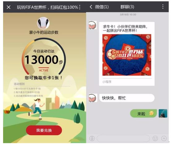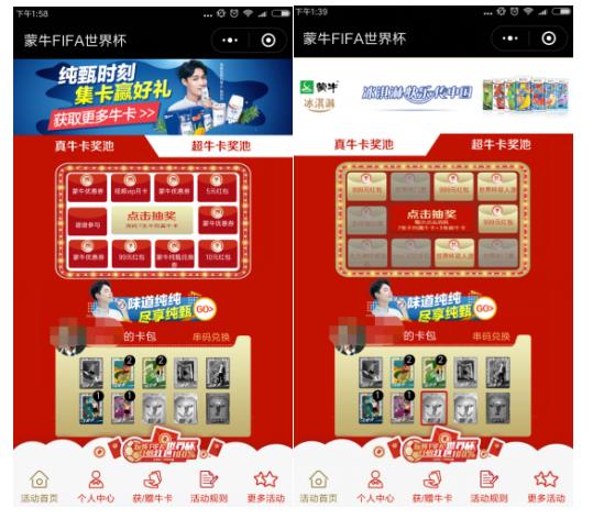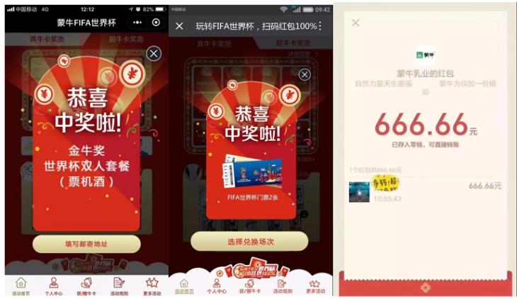 难道你就甘心旁观别人拿奖拿到手软吗?赶快参与进来吧,详细游戏规则有必要了解一下。 线下:购买蒙牛乳品,扫码赢红包 从3月15日至7月31日,消费者认准“玩转FIFA世界杯扫码红包100%”字样,购买蒙牛常、低、冰活动产品即可参加活动。通过扫描包装上的二维码,即可获得微信现金红包。红包金额分别为0.36元、0.66元、6.66元、66.66元以及666.66元,综合中奖率为100%。 线上:集齐真牛卡、超牛卡,兑换世界杯门票 全民集卡赢门票活动从3月15日起至6月13日结束,可以通过三种方式获得真牛卡或者超牛卡:第一种,购买蒙牛指定产品,除了立拿红包,同时可收获蒙牛牛卡;第二种,微信运动,1万步兑换一张真牛卡;第三种,微信社交互动,可以向好友索取或者赠送。