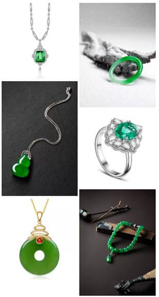 左1:18K金碧玺项链 左2:精品葫芦(福禄)翡翠项坠 左3:18K金碧玉天坛“祈福”系列项坠 右1:精品翡翠手镯 右2:18K金祖母绿戒指 右3:精品翡翠项链 关于翡翠玉石,自古有更有内涵的说法“选择和自己有缘的玉石”,又称为“玉缘”。你在挑选它的同时它也在挑选你。 进阶就选祖母绿,是高段位藏家必备。近十年来,祖母绿的价值一路飙升。既是陪伴一生的饰品,也是保值一生的投资。 五月初夏,精品翡翠、祖母绿、碧玺等镶嵌珠宝云集菜百门店,让珠宝迷们尽享视觉盛宴。