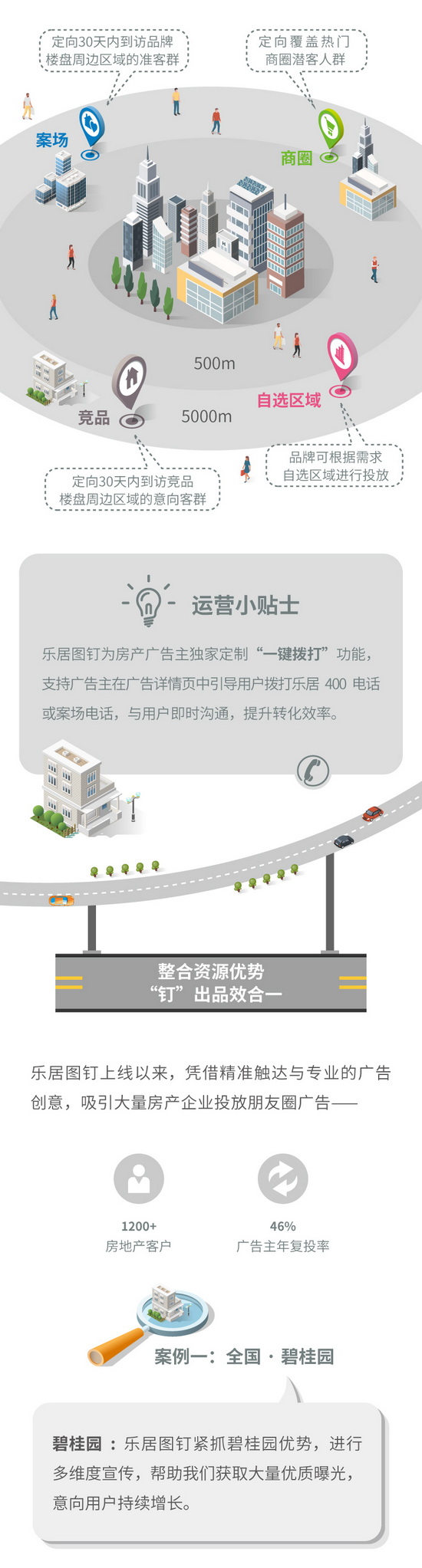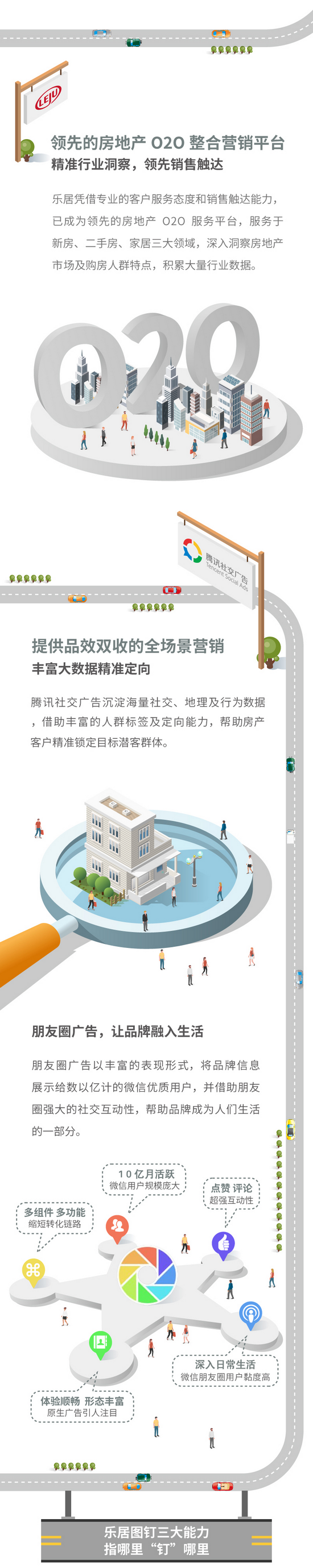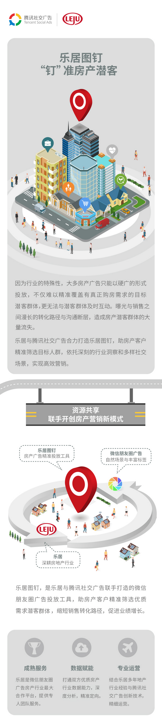 硬广投放铺天盖地,新楼开盘却鲜有问津,众多房产行业广告主面临着无效沟通的营销窘境。 乐居携手腾讯社交广告,针对房产行业亟待解决的营销难题,打造微信朋友圈广告投放产品——“乐居图钉”,助房产广告主精准触达优质潜客群体深入沟通,带动销售业绩攀升。 “乐居图钉”高效集客的秘诀在哪里?一张图为你解读房产行业缩短销售路径的奥秘: