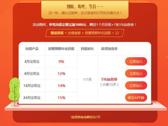即在活动期间,单笔出借定期宝满1000元,赠送1个月回报和1张5%的加息券,加息券计息15天,也就是说出借人参与活动不但可以多获得一个月回报,还能额外获得加息券,用于复投的话,也是一笔不小的收获。