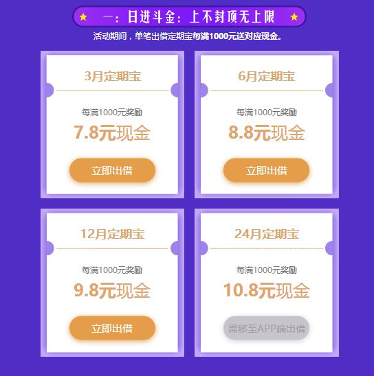 5月22日至5月26日,出借人单笔出借不同期限定期宝每满1000元,即可获得对应的现金奖励,上不封顶。
