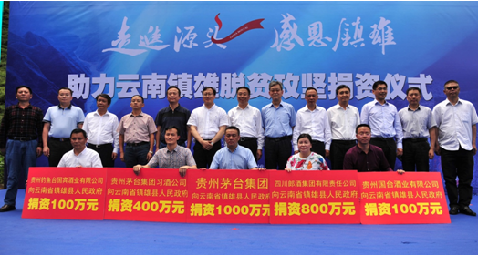 央视广告经营管理中心主任任学安 郎酒集团董事长汪俊林在与镇雄县有关方面对话时感慨道,“我们几家酒厂都是靠着赤水河逐渐长大的。镇雄人民为赤水河保护做出的贡献,对我们几家酒厂来说,也非常重要。所以,我们非常感恩源头地政府和老百姓给我们的帮助。” “茅台、郎酒、国台、钓鱼台和习酒,作为生于斯、长于斯的白酒品牌,我们都是赤水河良好的生态环境红利最直接的受益者。方圆五百里,除了我们,还有五粮液、泸州老窖、剑南春、董酒等数十个知名品牌,约占中国名酒的60%。” 李保芳强调,“今天,我们携五家企业和央视数万员工的心意来到这里,旨在省亲与感恩。茅台、郎酒、国台、钓鱼台和习酒,将共同捐资2400万元,用于支持镇雄县脱贫攻坚、建设小康。” 据悉,除了2400万元捐赠,茅台集团还决定从今年起,将“国酒茅台·国之栋梁”大型公益助学活动的资金向镇雄县优秀的高考寒门学子倾斜。