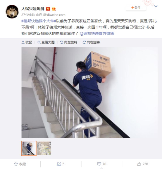 近日,知名铲屎官大锅只是喝醉收到了一份巨大的快递!原来是他给二哈们买的30KG狗粮!大锅果然是铲屎官界的霸道总裁,出手就是大方!而德邦物流的小哥哥面对30KG的狗粮,毫不露怯,一口气扛起来,送到了大锅家门口!并且,是免费送上门!收到狗粮的大锅十分开心地表示,自己以前从来不敢买这么多狗粮,德邦这次直接送30KG上门,让人大开眼界,原来快递还能这么送。 寄送不难,大件也上门 在中国,像大锅只是喝醉这样的大件快递消费者越来越多,大件快递成为了越来越多消费者的诉求。无论是买狗粮,又或是买家具,中国人都慢慢习惯于在电商平台购买,让快递送上门。但是,市场中竞争者众多,服务质量参差不齐,特别是大件快递中,一直存在着大件难送的现象。 “原来买狗粮买多了会被快递员吐槽东西太沉,放到楼下就走了,得自己吭哧吭哧扛上来,太累了,买少了又不够吃,眼看着家里的狗狗们饿,作为铲屎官的我心里着急。”大锅只是喝醉对于德邦的配送十分满意,“这次我买的狗粮是由德邦大件快递派送的,一开始听卖家说30kg可以免费送货上门我心里还是有点忐忑的,结果没想到真的又快又好又便宜!以后买狗粮,我再也不用担心了,在家躺着就可以放心囤货。” 曾经的铲屎官买狗粮,要考虑卖家是不是嫌寄得麻烦,快递配送员是不是不想派送,运费是不是过高,配送时间会不会过长等一系列问题,而现在有了德邦快递,大件配送的问题就迎刃而解了。 送货上门人力物力都消耗的更多了,是否会让德邦失去价格优势?实际上,面对日益增加的电商大件需求,德邦进行了运营环节升级和研发投入升级,在提高了运输效率和品质的同时,还能保证了寄件价格的实惠,让消费者享受快递的服务水平,只收物流的价格。 德邦快递,以大取胜 在许多人的印象里,德邦是个做物流的,快递行业已经有了顺丰作为领头羊,其他大大小小的快递都在激烈竞争,此次进军快递行业,对于德邦来说是否是个明智之举呢? 其实,纵观快递行业,只有顺丰是以小件信函包裹为主,以“大”字闻名的快递还属于完全空白的市场。而德邦在物流行业拥有22年的丰富经验,一直以专业为服务之本。其专业性一直保持在行业领先地位,建立了完善的物流运输系统,运输网络覆盖面在全国达34省,建立了近万个网点,乡镇级覆盖率高达94%,这让德邦有足够的实力,将物流的优势转变为快递的优势,以“大”取胜,时刻以消费者的利益为出发点,贯彻大件快递免费上楼接送货的理念,切实为商家和消费者带来便利。德邦快递目前的明星产品“3.60特惠件”,正是应了市场的需求而推出,成为快递行业第一款大件快递专属产品,德邦做大件快递的口碑也由此树立。 德邦之所以能够在快递寡头林立的市场中异军突起,还有一道杀手锏,那就是对服务品质的关注。德邦通过重金激励快递员,让快递员主动服务于客户,保证大件快递服务满意度。在2018年年会上,德邦董事长崔维星拿出重磅大奖,用价值820万的黄金,奖励过去为顾客做出优异服务的82名“五星快递员”,每人10万元金砖。“德邦的客户体验必须要有翻天覆地的变化,希望通过重金激励,激发末端主动服务客户的积极性。”崔维星的想法和办法,简单直接却又直击重点。 7月2日,水立方有大事发生 作为快递行业的新兵,7月2日,德邦将在水立方搞一件大事情。据说,这是德邦物流将向顺丰等快递巨头发出挑战。德邦欲凭借自身专业性与实力,正式进军大件快递行业,凭借“大”的特点,掀起快递行业的波澜。行业老大哥顺丰确立了行业“快”的标杆,这次,德邦会不会在水立方用“大”刷新人们对快递的认知呢? 从物流界的老大哥,到快递界的新兵蛋子,德邦到底能否顺利实现物流到快递的转型,刷新消费者对“大件快递”和德邦的认知,顺利进军快递行业,以“大”取胜,让我们7月2日,拭目以待! 中国首席商业资讯门户;更多内容请关注中国商业网各频道、栏目资讯。 免责声明:凡本站注明 “来自:XXX(非中国商业网)”的新闻稿件和图片作品,系本站转载自其它媒体,转载目的在于信息传递,并不代表本站赞同其观点和对其真实性负责 |