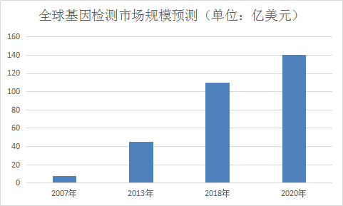 基因检测蓝海大市场已全面开启 据BBC Research 的统计,2007年全球基因检测市场的规模为7.9亿美元,到2013年市场规模为45亿美元,预计2018年全球基因检测市场规模将达到110亿美元,年复合增长率为29%。目前,中国基因检测尚处于起步阶段,预计未来五年复合增速在35%左右,市场规模将突破300亿元。