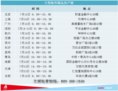 据悉,为了方便广大意向人士甄选海外优质房产项目,本周末(7月14日、15日),海外房产服务权威机构澳信Ausin将在全国各大城市举办“大型海外精品房产展”高端展会,重磅推介英国、澳大利亚、美国、新西兰等国优质房产项目,欢迎莅临展会了解更多详情! 大型海外精品房产展 北京(7月14日 9:00——18:00):财富金融中心30层 上海(7月14日10:00—18:00):外滩中心49层 广州(7月14日 9:00——18:00):高德置地冬广场G座42层 深圳(7月14日 9:00——18:00):平安金融中心 86层 杭州(7月14日 9:00——18:00):坤和中心3501 无锡(7月14日 9:00——18:00):恒隆广场办公楼48层 苏州(7月14日 9:00——18:00):晋合广场2号15层 长沙(7月14日 9:00——18:00):万达总部国际C3座17层 昆明(7月14日 9:00——18:00):柏联广场A座10层 青岛(7月14日10:00——18:00):中铁•青岛中心 A座 16层 天津(7月14日14:00—18:00):天津宾馆1楼 大堂吧 天津(7月15日14:00—18:00):仁恒置地国际中心19层 合肥(7月14日9:00——18:00):华润大厦A座24层
