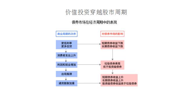 债券市场在经济周期表现非常有规律,如图所示,更低利率,更多信用,接着消费者支出、利润就业一起增加,出现瓶颈后就通货膨胀,不同类型的债券投资性价比就不一样了。
