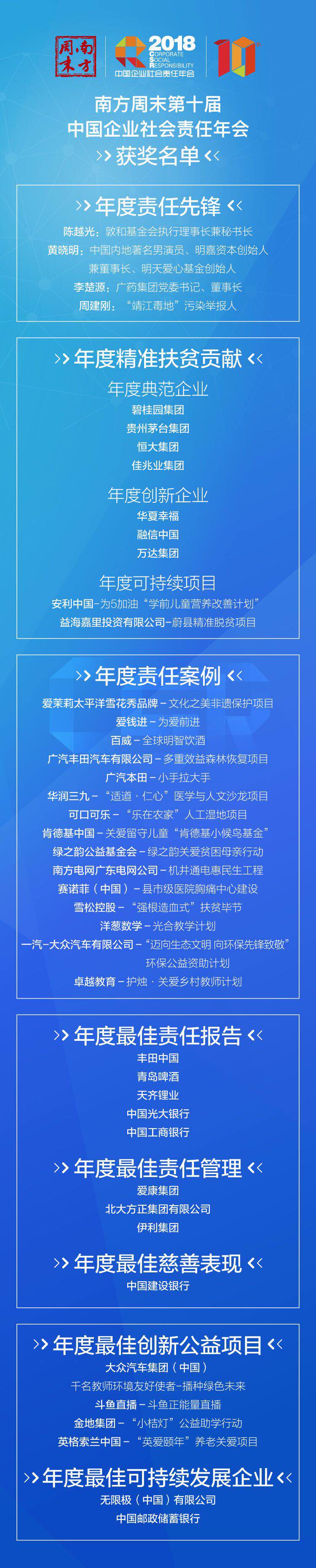 2018年7月27日,共历时两天、由南方周末主办的第十届中国企业社会责任年会在北京圆满落幕。围绕“构建责任共识”的大主题,国内外关注企业社会责任、关注公益慈善及社会创新事业的政府机构、企业代表、公益组织及媒体人员等再次齐聚现场。100余位嘉宾、超过80家企业代表、700余人次出席年会。 启航于2008年,中国企业社会责任年会已经走到了第十个年头。南方周末报系总裁兼党委书记黄灿在主办方致辞中表示:“立规、建言、弘道,南方周末在中国企业社会责任发展的十年间从未缺席,她不仅仅是时代的记录者和见证者,也是企业行为的评价者、CSR价值的弘扬者,还是未来道路的探索者和行动者。” 南方周末报系总裁兼党委书记黄灿发表致辞 初心与挑战:CSR前行中的变与不变 本届年会发布了《CSR在中国:2008-2018CSR观察报告》,由南方周末常务副总经理兼南方周末研究院秘书长孟登科解读,阐述了全球视角下的CSR趋势,系统地总结了中国企业CSR的发展历程,并回顾了南方周末的十年CSR担当。 企业社会责任概念自20世纪80年代在西方发达国家兴起以来,企业在政府、非政府组织和公众的监督与推动下,逐渐主动承担起社会责任,更自觉地对广大的利益相关者负责。然而,随着时间的演进,CSR的发展也面临着效率低下、项目可持续性低等新困境。政府加强引导,企业提高履责自觉性,以及拥抱短视频与人工智能等新技术,则成为解决这些问题的关键。 圆桌对话环节,由南方周末综合新闻部记者谭畅主持,和众泽益志愿服务中心创始人及主任王忠平、中国工业企业社会责任智库社会责任标准专业委员会主任王海龙、中国社科院经济学部企业社会责任研究中心常务副主任张蒽、中国扶贫基金会副秘书长丁亚冬、爱钱进CEO蔡园竹、洋葱数学联合创始人兼CEO杨临风,6位大咖齐聚现场,围绕“初心与挑战:CSR前行中的变与不变”展开热议。 圆桌对话围绕“初心与挑战:CSR前行中的变与不变”展开 陈越光、黄晓明等获颁2018年度责任先锋 本届责任年会在各行业、各领域中推举出年度“责任先锋”,借以表彰那些“对企业社会责任和公益有着自己的理念和坚持,乐于付诸实践并取得了公认成就的人,鼓励他们去引导和带动更多有志于此的人”。 本届年会揭晓的“责任先锋”有:敦和基金会执行理事长兼秘书长陈越光,中国内地著名男演员、明嘉资本创始人兼董事长、明天爱心基金创始人黄晓明,广药集团党委书记、董事长李楚源,“靖江毒地”污染举报人周建刚。 黄晓明获颁2018年度责任先锋 发掘绿色价值,大咖圆桌热议 “发掘绿色价值”是本届年会的年度关注单元,年会现场发布了《2018企业绿色产品调研报告》,围绕绿色产品的定义、标准、收益等,阐述了绿色产品在中国的现状。环保和绿色是一切崇高价值的基础,绿色的产品则可以为企业节省更多的资源及成本,带来更高的经济效益。推进我国的绿色发展,需要企业在其中发挥积极的作用。 年度关注圆桌对话由南方周末绿色新闻部编辑汪韬主持,4位大咖聚焦绿色产品,共同探讨了“绿色价值”的相关话题。中国标准化研究院资环分院副院长张新认为,绿色产品与自然环境保护及资源保护密不可分。公众环境研究中心创始人及主任马军则指出,企业应该协同上下游,打造绿色产业链,为产品注入更多绿色特性。 中国绿发会秘书长周晋峰指出,绿色产品具有全生命周期,综合考虑能源、环境、生态、健康等因素,方可称为绿色产品。巴斯夫全球高级副总裁郑大庆立足经营者的角度,提出企业应将可持续发展的理念融入到管理体系中,通过创新研发推出更多绿色解决方案,力求打造更“绿”的产品。 年度关注圆桌对话:各方协力,发现绿色价值 此外,年会现场还发布了《2017-2018中国互联网行业CSR观察报告》,由商道纵横和益普索提供智力支持,聚焦现阶段我国互联网企业的发展生态,分析了其趋势、特点及不足。南方周末还联合商道纵横发布及解读了《中证100指数成分股CSR报告实质性分析(2018)》。 另外,可口可乐大中华及韩国区可持续发展总监田文红,针对“乐在农家”项目分享了人工湿地保护经验。百威亚太北区法律及企业事务副总裁王仁荣,则围绕“践行明智饮酒,酿造更美好世界”这一主题发表了演讲。 构建美好出行,共享未来生活 藉十周年之机,本届年会还特别分设了汽车行业CSR分论坛与房地产行业CSR分论坛,分别于2018年7月26日上午、下午举行。 汽车行业CSR分论坛发布了《2017-2018中国汽车行业CSR观察报告》,表彰了2017中国汽车企业社会责任榜上榜企业,全球契约中国网络执行秘书长韩斌、商道纵横副总经理兼合伙人彭纪来、木仓科技营销中心总经理汪宙、大众汽车集团(中国)企业社会责任部高级总监殷进齐聚于此,围绕“汽车行业CSR的长效机制”,探讨如何构建更环保、更美好的出行未来。 下午举行的房地产行业CSR分论坛发布了《2017-2018房地产行业CSR观察报告》,表彰了2017中国房地产企业社会责任榜上榜企业,自然资源部调控和监测司巡视员、中国科学院大学国家土地科学中心主任董祚继,以“严格国土空间用途管制,推动绿色低碳循环发展”为主题进行演讲。北京工商大学经济学院教授,企业营商环境研究中心主任郭毅,碧桂园集团新体系推进团队组长、筑梦公司总经理孙军,朗诗常青藤事业部副总经理