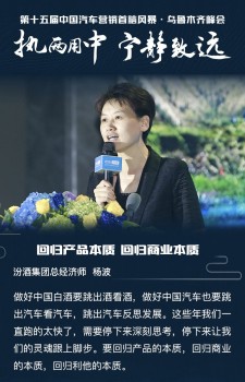 在这场汽车营销人的“家庭聚会”上,汾酒集团总经济师杨波以特别跨界嘉宾的身份,带来了一场跨界营销的演讲。提及酒与车的共性,她主张跳出酒看酒、跳出汽车看汽车,“回归产品本质,回归商业本质,回归利他本质”。