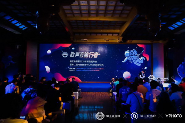 猫王收音机新品发布会 | 图片提供:VPhoto 发布会上,猫王收音机创始人兼首席产品官曾德钧携手团队,展示了两款获得美国2017CES创新奖的新产品,介绍了“Oh Play猫王妙播”软件APP以及自制节目内容的“猫王音乐台”。精心构思的发布会人文味道十足,以“致声音旅行者”这一主题,致敬人类探索宇宙的浪漫精神。