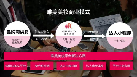 唯美拥有超过10年的全球美妆供应链经验,服务过国际品牌的中国市场运营,唯美美妆是一个美妆行业的S2B2C平台,通过供应链整合联合品牌方为美妆达人赋能,为每个达人建设一个小程序美妆专卖店,平台一件发货;并为优质达人孵化达人品牌,构建一个美妆品牌孵化器。