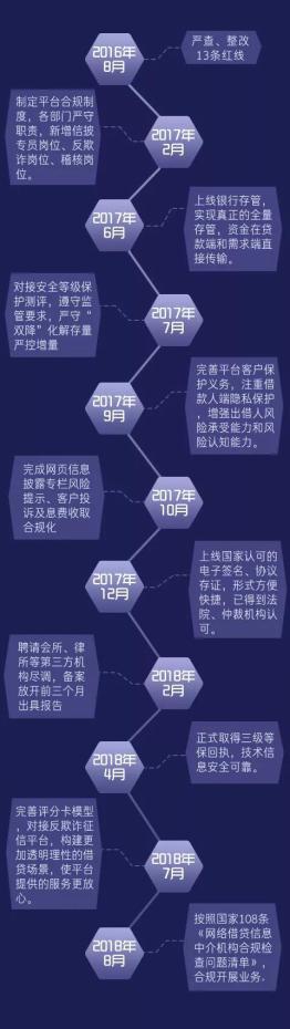 让我们携手前行,一同成长,伙伴们—— 请认识到中国的通货膨胀率接近8%,有必要采取手段进行资产保值,对美元、黄金、股票、房产和理财产品等合理配置; 请认清金融的本质,超过无风险利率的收益是风险上的溢价,因此在投资的风险和收益间有平衡的认识; 请探索清楚网贷平台涉及自动投资+债转标、大额标、使用银行存管这三点上是否做到真正合规; 请试着克服动物精神,遇事不急于褒贬,对项目有良好的求知欲,能亲自验证、批判和质疑; 请尽情享受复利的喜悦,但如果遭受了亏损,要在逻辑上反思;遇到了爆雷,要坚持维权;获得了盈利,亦要记得平常心; 最后,我们盼望所有人健康富足!我们相信真诚自有万钧之力! 囧羊平台合规工作时间轴