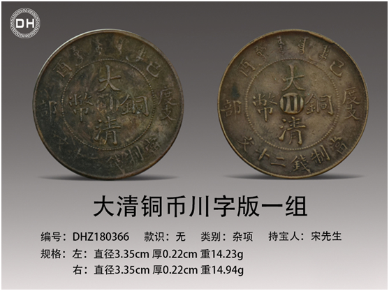 market is very good and it is a good choice for collecting investment. 近日,广州德鸿公司有幸征集到一组宋先生的大清铜币川字版,上图由左至右,规格分别为:直径3.35cm,厚0.22cm,重14.23g;直径3.35cm,厚0.22cm,重14.94g。钱币正面珠圈内直读“大清铜币”四个汉字,内嵌一阴文小字“川”字代表四川;珠圈外上端是满文的“大清铜币”字样,其两侧为干支年号“己酉”,左右两侧边缘中间缘分列“度支”“部”,下端环纪值文字“当制钱二十文”。钱币背面珠圈内为蟠龙图,神龙身躯蜿蜒,龙珠、祥云、海水等纹饰伴其左右,栩栩如生,尽显其威武霸气,极富震撼力;珠圈外上缘有“宣统年造”字样,下缘为英文“TAI-CHING-TI-KUO COPPER COIN”,汉译为“大清帝国铜币”。整币铸工神乎其技,间架平衡舒展,文字清秀俊美,纹饰深俊清晰,包浆浑厚自然,充满了历史的温润之感,有着难以言喻的历史价值、艺术价值和收藏价值。 Recently, Guangzhou Dehong