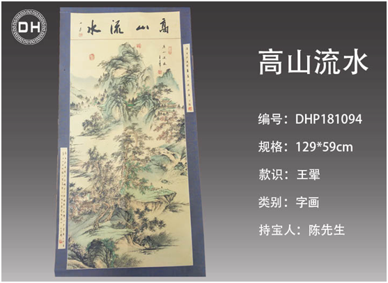unique landscape and beautiful scenery. Value and collection value. 近日,广州德鸿国际有幸征集到陈先生的一幅高山流水作品,规格为129*59cm,纸本立轴,落款“王翚”(huī)。此幅作品的顶部题有“高山流水”四字,左右两侧有题字,字体随意舒展流动,自然有动势,其笔意收放自如,布局疏密得体,具有很有的书法艺术价值,欣赏性很高。其内容画的是写意的高山流水,别有韵味,可见作者胸有丘壑手有笔墨,是为山水佳作。经历过战火纷飞之后,本是易毁的书画作品却能完好地保存至今日,殊为难得,其画面构图布局和谐,远山近景,山峦层叠,松木繁茂,气韵雄浑,精彩绝伦,为收藏之品。 Recently,