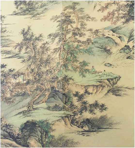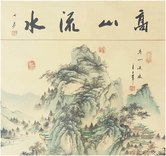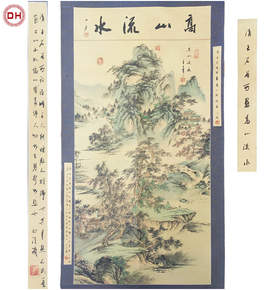 luxuriant, the charm is magnificent, and the collection is wonderful. Product. 此幅高山流水全图布局严谨,采用高远构图,崇山峻岭,巍峨挺拔,绵延不绝;苍树迎风,枝干虬曲,穿插掩映;溪水湍流,穿行山涧,倾泻而下;屋宇隐与林间,一派可游可居的意境。全作运笔松散独到,恰到好处描绘山体风貌,浑厚而清爽。其设色画以浅绛为主,结合青绿与水墨的长处,保持了文人绘画中简淡清逸的审美特色。山崖平地上,两位青衫高士席地而坐,一人盘膝抚琴,一人悠然聆听,观瀑听泉,看山赏景,怡然自得。作者以妙笔绘就高山流水的壮丽景象,观其气势,赏其丘壑,玩其笔墨,意蕴悠长,气韵灵动,是一幅难能可贵的字画作品,具有很高的艺术价值和收藏价值,值得珍藏 The