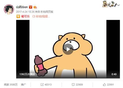 随后《Gon的旱獭》第一季全网上线,反响热烈,山药Gon的微博粉丝在一年多的时间内从4万暴增到108万,微博上#Gon的旱獭#话题的阅读量超过2.5亿。