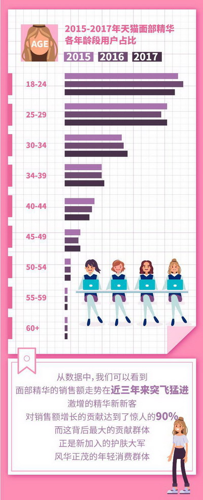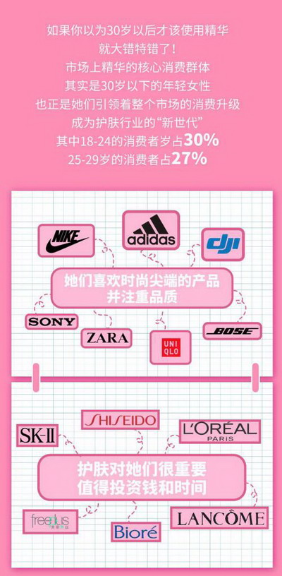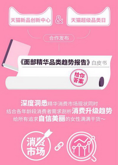 俗话说,抹最贵的精华,熬最深的夜。对无数修仙少女而言,精华就像是救命药一般的存在。虽然这种修仙方式不可取,但足以看出人们对于精华功效的认可程度。 9月1日至9月4日,天猫超级品类日推出精华专场,精准把握精华市场消费动向、挖掘全网最具潜力的精华单品,推出限时尊享明星多重礼遇、满199减100等优惠回馈消费者。 此次天猫超级品牌日精华专场不仅联动行业各大舰长品牌打造品类大事件,更通过大数据洞察年轻用户群体“精益求精”的场景化个性化需求,引领消费认知升级的同时赋能商家与消费者,助力品类产业结构升级。 精华市场年轻化个性化,品类日助力行业升级发展 随着消费升级,人们对于护肤品的价格敏感度不断减弱,取而代之的是对功效的关注。这其中,面部精华的需求在不断扩大和升级,甚至逐渐呈现出年轻人占据主流消费地位的趋势。 “美”是人们的永恒追求,相较于通过化妆品来遮掩面部瑕疵,人们越来越注重护肤,为化妆打好底子。作为护肤品中的极致,精华不仅具有抗衰、淡斑的功效,更在控油、美白、保湿上效果显著。这令它得以冲破年龄的桎梏,成为众多90后追捧的对象。 随着护肤意识的觉醒和受众人群的扩大,面部精华的消费人群,已经连续两年增长超过200%。仅从跨境消费上来看,2017年面部精华的市场需求全面爆发,从16年仅为口红市场的三分之一增长至几乎与口红市场持平,而今年甚至可能赶超。在跨境美妆领域,精华品类已经成为该市场的TOP3。这意味着,精华在美妆市场上已经拥有了不可撼动的影响力。 与快速扩张的市场相对应的,是日益个性化的护肤需求。尤其是90后新势力的进入,让个性化养肤成为了热门话题。 2017年,“安瓶精华”成为全新药妆护肤趋势,正式引爆医美精华。去年,医美精华同期增长408%,成为“护肤极客”们的新宠,这其中90后占据了50%。对于众多新进入精华市场的90后们来说,不仅仅是品牌,精华中是否含有玻尿酸或者水杨酸等医美级别的功能性护肤成分,能否实现“一瓶专效”也是他们选择精华时的评判标准。 事实上,随着人们对于面部精华认知和使用率的上升,各个品牌也增大了精华品类的市场投入,尤其是高端品牌,更是将精华作为战略产品。这一变化,反向推动了精华品类的消费升级。精华使用日常化,消费选择功效化,已经成为了目前精华护肤的显著特点。 在此背景下,天猫超级品类日联合海蓝之谜、雅诗兰黛、娇韵诗、法国娇兰、OLAY、巴黎欧莱雅、黛珂、AHC等旗舰品牌,诚意开启精华专场,同时天猫国际还将联合众多旗舰品牌提供更多“医美原液精华”供消费者进行选择。 天猫超级品类日精华专场将以平台优势打造国内市场的品类日专场活动,实现从新锐到大众到高端的品牌全面渗透,通过精华品类推动各品牌在天猫平台上的声势爆发,助力更多消费者拥有理想的护肤体验。 精华趋势报告正式发布 阿里大数据洞察护肤新世代消费画像 阿里大数据帮助天猫实现精准匹配消费者需求。本次活动,天猫超级品类日联合天猫新品创新中心,重磅发布《面部精华品类趋势报告》,用大数据描绘护肤新世代消费者画像,并深入洞察她们的“精益求精”之道。 报告显示,面部精华的销售额走势在近三年来突飞猛进,主要得益于新消费群体的加入,激增消费群体对销售额增长的贡献率达到了惊人的90%。 年轻消费者正在以逐年提高的姿态扩大销售额占比,其中30岁以下护肤新世代成为驱动消费升级的核心力量。海蓝之谜、雅诗兰黛、娇韵诗、法国娇兰、OLAY、巴黎欧莱雅、黛珂、AHC这八大舰长品牌倍受她们热捧。在18-29岁的年轻消费群体中,中端精华品牌深受欢迎,高端精华品牌则更受30岁左右的女性青睐。 从购买场景来看,“精细化”成为市场关键词,多产品组合使用也逐渐成为该品类消费升级的核心所在。数据显示,“帮助水乳吸收”、“针对性功效”、“营养成分浓度高”成为了影响女性消费精华的重要驱动。有78%的年轻女性在购买精华时,会选择和水乳护肤品不同的品牌,87%的消费者会选择和水乳产品不同的功效。还有25%的女性消费者会根据季节差异,来使用不同的精华。 白皮书还显示,高效、快速、安全等关键字是精华品类市场发展的核心诉求。精华的“基本功”最受到人们关注,但同时医美概念和成分党盛行,以其满足高效诉求的专业性掳掠人心。高端精华正通过单品创新,加入到医美竞争, “高效深入”成为整个精华市场的大趋势所在。 线下超现实肌肤料理餐厅 天猫超级品类日打造另类饕餮盛宴 面对日渐年轻化、个性化的护肤品消费趋势,天猫超级品类日巧妙地洞察到了精华呵护肌肤与顶级食物进补之间的共通性,以更符合年轻人的方式,在线下打造“肌肤精华食验室”,将精华做成一道道精致的“肌肤料理”。让消费者通过参与与众不同的互动体验,直观感受精华宛如顶级食材般焕能美肌的魔力。 9月1日-2日,天猫超级品类日超现实肌肤料理餐厅即将落户上海杨浦区合生汇,多套精华呵护顶级大餐,精美摆盘和吧台陈列,用另类仪式感满足消费者肌肤的口腹之欲。 现场更有海蓝之谜、雅诗兰黛、娇韵诗、法国娇兰、OLAY、巴黎欧莱雅、黛珂、AHC等8个品牌精华体验区,参与完成指定动作即可获得贵妇精华礼盒。40个创意餐盘拍照区,护肤大餐想怎么秀就怎么秀。 此次天猫超级品