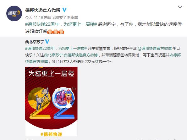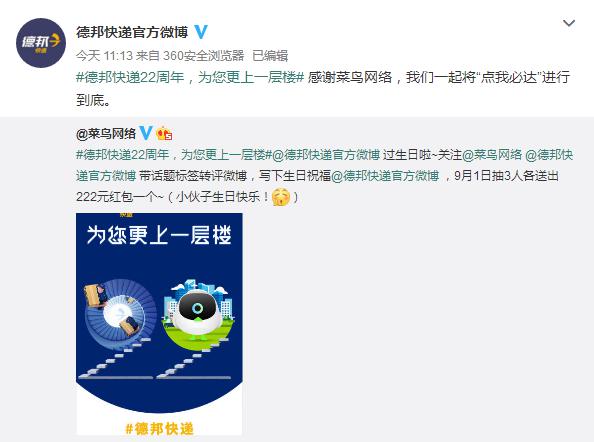 近几年,都特别流行这么一句话:别人家...... 对于云合来讲,我特别羡慕别人家公司。动不动在年会上发个金砖作为年终奖;毫不犹豫为员工家人发十多年工资补助、为员工子女补贴学费;不假思索为员工免费举办巴厘岛婚礼...... 也许会有小伙伴问:哪家公司福利这么好?云合要揭开谜底,这别人家公司正是德邦快递。 不难看出来,德邦快递真心把自己员工当做家人看待! 羡慕不羡慕?其实不用羡慕,德邦快递这份真性情由内延续到外,前段时间为广大用户们带来巨大福利。德邦快递22周年庆之际,在官方微博上,以“为您更上一层楼”为话题,联合40多家品牌送红包。
