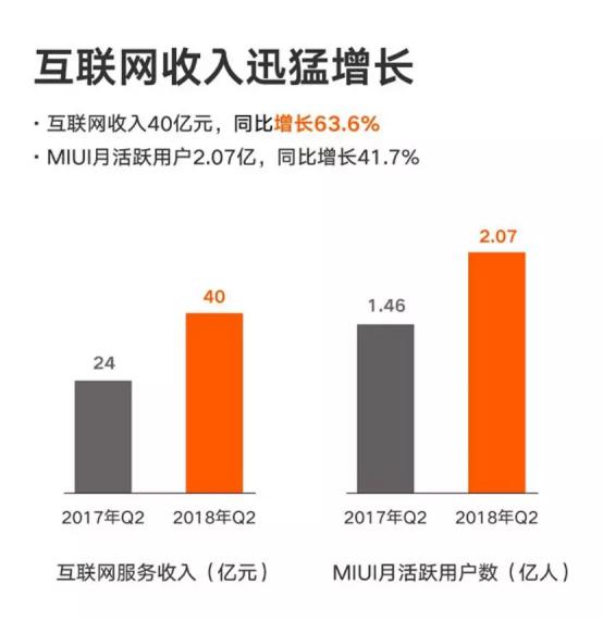 这些基本事实不应被漠视,至于估值则是另一回事。“互联网”标签为什么那么金贵?从表面上看“互联网”标签似乎意味着更高的行业市盈率,但在本质实际上是对小米业务离更牛掰的“剃须刀+刀片”收入模式还有多远,所有的硬件公司都想脱离只卖硬件赚钱,转向通过硬件设备圈定用户,构建生态系统,提供各种服务收取费用。 而从一开始这就是小米的目标,小米最初想做的本来就是从圈用户思路出发转而做手机,绕了个大椭圆,小米终归在回归初衷,而这个椭圆再大,几年创业过程中,互联网作为小米的核心其实一直没变。所以从这个角度看,其互联网业务63.6%的营收同比增速在此处就体现出意义来了。就像招股书中给小米下的定义一样:一家以手机、智能硬件和 IoT 平台为核心的互联网公司。 从小米二季度财报看,小米用户MAU同比增长44%,已经突破2亿达到历史新高,这个巨大的用户基本盘在业界没什么争议,接下来的关键就是看看小米能否从MAU2.07亿用户的基本盘开发出更多的服务类目,获得更多的服务收入,这才是问题的关键。