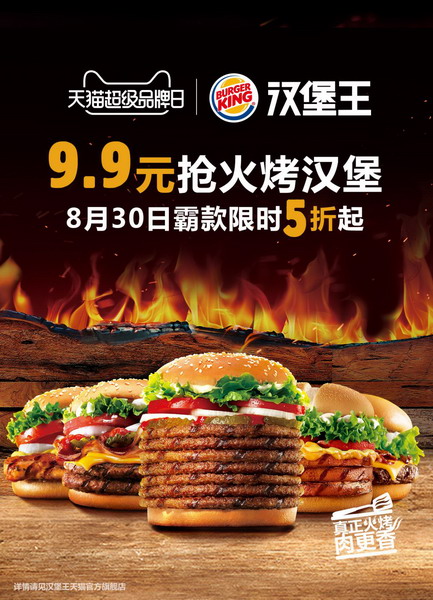 “真正火烤”超过60年的汉堡王,一直致力于给消费者带来美味。2018年8月30日,把“玩火”营销做出了经典的汉堡王,联合天猫超级品牌日展开了一场“吹气斗火赢美味,火越大福利越大”专题活动,将“玩火”进行到底。 在天猫超级品牌日活动当天,汉堡王天猫旗舰店不仅推出8000份限时9.9元的果木香风味火烤鸡腿堡,引得食客们争先买单。还为天猫超级品牌日活动专门定制全明星火烤餐,并且无论是火烤单人餐、多人餐等,通通“第二份半价”。还有火烤套餐限时5折的超低价。同时,汉堡王更为活动准备了专供天猫、门店无售的“超级菜单”——三层金沙烤猪肘堡,大饱了天猫食客们的口福。活动当天,汉堡王天猫旗舰店访客量达到数百万,订单量破万,天猫超级品牌日真正为汉堡王点燃一把卖堡销量飙升的熊熊大火。