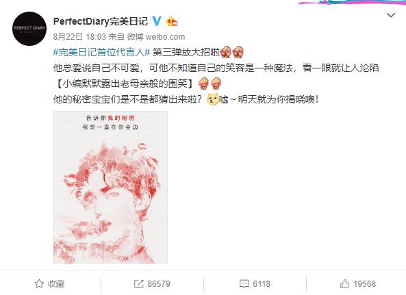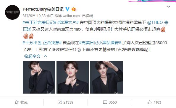 如果这还不算爱,完美日记在微博上大玩的生日梗——每条与朱正廷相关的微博都卡点在“1、3、8”这3个与其生日(3月18日)相关的数字节点发送算得上是走心鼻祖了,还有专程邀请国内顶尖摄影大师陈漫为其操刀的代言大片硬照,收获了一大波粉丝的怒赞。