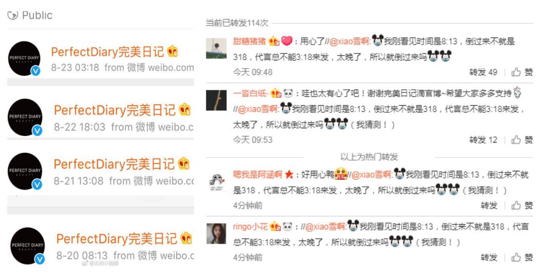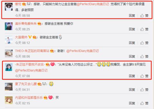 接着,品牌请代言人朱正廷为粉丝钦点了一款“珍珠糖色”,用自家代言人的粉丝名作为产品昵称,完美日记这波宠粉操作也是666,小姐姐们再次被感动得不要不要的,后台各种花式表白金主爸爸的声音足见品牌好感度的节节上升。