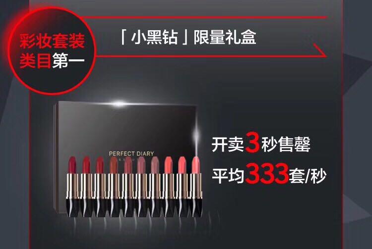 (上海外滩震旦大屏广告) 在“天猫99”品牌大促上,完美日记新品小黑钻唇膏60秒内卖出了2万多支,小黑钻礼盒更是3秒被抢空。“全行业第一!访客数第一!买家数第一!”数个第一的title也是很燃了。