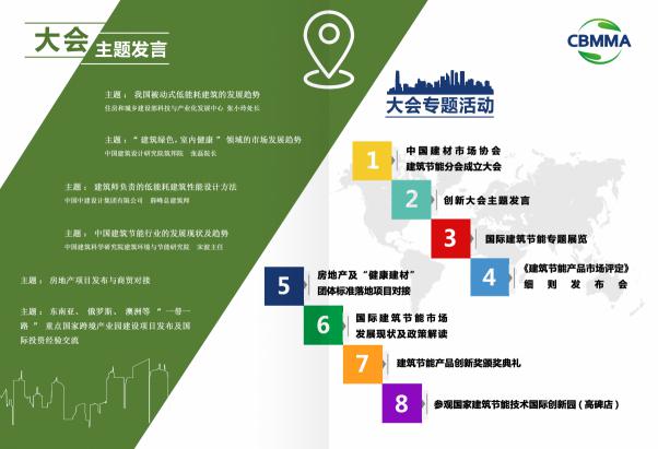一、大会邀请主要专家及议题: 1. 我国被动式低能耗建筑的发展趋势 ——住房和城乡建设部科技与产业化发展中心北京康居认证中心 张小玲主任 2. “建筑绿色,室内健康”领域的市场发展趋势 ——中国建筑设计研究院筑邦院 张磊院长 3. 建筑师负责的低能耗建筑性能设计方法 ——中国中建设计集团有限公司 薛峰总建筑师 4. 中国建筑节能对标国际的发展现状及趋势 ——中国建筑科学研究院建筑环境与节能研究院 宋波主任 5. 国内外被动式低能耗建筑的十大先进技术 ——建筑材料工业技术监督研究中心首席专家、中国被动式集成建筑材料产业联盟主席 崔源声 6. 既有建筑外墙外保温修缮标准及应用技术 ——中国建筑科学研究院建筑材料研究所墙体材料技术研究中心 曹力强主任 7. “一带一路”国家倡议对拓展国际市场的展望 ——北京大学城市公共服务标准化研究课题组 姜峰 8. 我国节能防火门窗的先进技术 ——山东省节能技术研究院建筑保温 江海红总工程师 9. 借势“一带一路”,加快建材企业“走出去” 的步伐 ——中国建筑材料联合会国际合作部主任、中国建筑材料联合会“走出去”办公室主任、中国建材国际产能合作企业联盟秘书长 丁立忠 10. 房地产项目发布与商贸对接 11. 东南亚、俄罗斯、澳洲等“一带一路”重点国家跨境产业园建设项目发布及国际投资经验交流