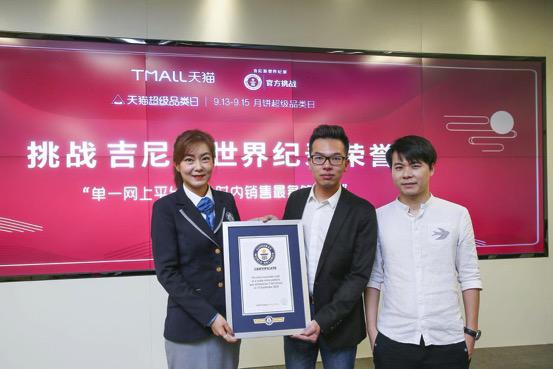 (左一,吉尼斯世界纪录认证官侯颖女士,正中,天猫食品总监王丹) 9月14日,吉尼斯世界纪录认证官侯颖女士授予了天猫是“单一网上平台24小时内销售最多的月饼”的殊荣。