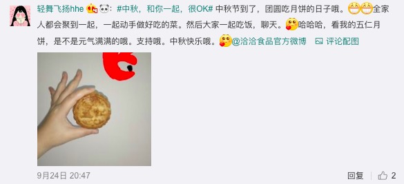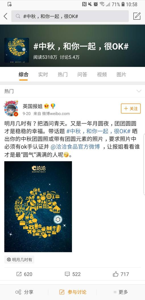 9月20日,洽洽官方微博发起#中秋,和你一起,很ok#话题活动,邀请网友晒出中秋团圆照,照片中必须含有OK元素,凭借着巧妙的创意点和洽洽全球的影响力,活动一经发出便得到网友的热烈响应,来自英国等国家的微博KOL也都发文参与。截止到9月25日,仅微博话题#中秋,和你一起,很ok #的阅读量就达到5318万,讨论量多达5.4万条。