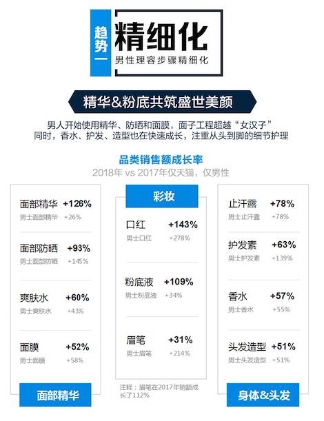 根据天猫大数据显示,现在男士仍然很意头发造型、香水和止汗露。仅在天猫,2018年这3个品类增速稳定,分别保持在51%,55%,78%同比增速。 另一方面,男士更注重“面子工程”,他们开始使用口红、眉笔、精华、防晒和面膜等产品。2018年,仅在天猫男士眉笔、男士口红、男士面部防晒的同比增速可观,分别为214%、278%、145%。