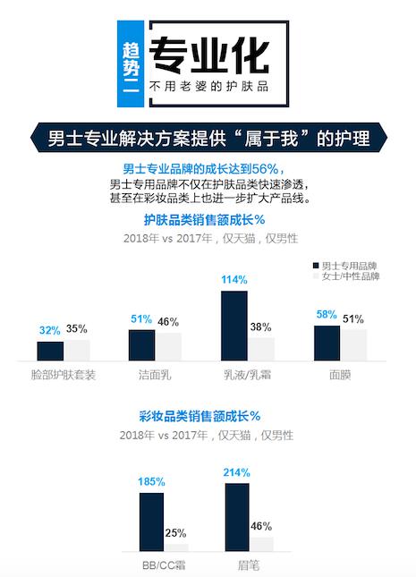 除了更注重护肤和保养,越来越多的男士也开始购买彩妆。同脸部护肤、身体洗护、香水、头部洗护和口腔护理相比,男士彩妆同比增速最快,达到了89%。其他品类的增速保持在50% 左右。 前两年,倘若男人想要臭美,可能只有凑合着用一用女性专用粉底液、眉笔和化妆水。但根据天猫大数据显示,男士专用品牌的同比增长达到了56%,男士专用 品牌不仅在护肤品类快速渗透,在彩妆品类也进一步扩大产品线。 2018年仅在天猫上,男士专用脸部护肤套装销售同比增长32%,男士专用洁面乳销售同比增长51%,男士专用乳液乳霜销售额同比增长114%,男士专用面膜销售额同比增长58%。