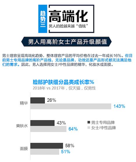 另一个新消费趋势是,消费升级是真的“男女平等”。男士理容呈现高端化趋势,过去一年整体理容产品的平均价格上升16%。但目前整体来看,男士专用品牌的高端产品无法满足他们的需求。因此,如果要用高端品类,男性会直接选择 用女性的高端化妆品品牌。 与此同时,00后的年轻人也丝毫不放松对颜值的要求。据天猫发布的《中国型男理容白皮书》显示,00后已经开始买抗衰老型精华,2018年00后购买的抗衰老型精华同比销售增长336%,领跑其他所有年龄段男士。 中国首席商业资讯门户;更多内容请关注中国商业网各频道、栏目资讯。 免责声明:凡本站注明 “来自:XXX(非中国商业网)”的新闻稿件和图片作品,系本站转载自其它媒体,转载目的在于信息传递,并不代表本站赞同其观点和对其真实性负责 。 |