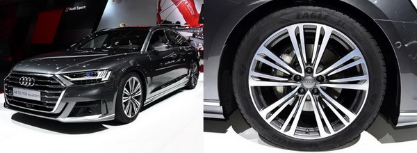 奥迪A8L 50 TDI quattro搭载鹰驰 F1 Asymmetric® 3轮胎 作为久负盛名的鹰驰系列家族的最新成员,鹰驰F1 Asymmetric®3轮胎与全新A8的澎湃动力与操控实力相得益彰。得益于一系列技术革新,鹰驰F1 Asymmetric®3轮胎完美满足了全新奥迪A8对轮胎极致操控乐趣和安全性能方面的诉求,无论是在干燥路面还是湿滑路面均能提供出色的制动表现以及迅捷的操控响应,让驾驶者尽享驾控之道。 固特异EfficientGrip御乘轮胎 固特异御乘轮胎采用独创的“静音胎面”技术,有效降低轮胎接地产生的噪音,为驾驶者带来静谧舒适的驾驭感受。由于御乘轮胎拥有强抓地配方的接地面,以及大量的接地面刀槽数量,因此车辆在各种驾驶环境下都能具备卓越的抓地效果以及过弯性能。同时,御乘轮胎还具备卓越的燃油效能。该轮胎由高密度硅胶混合物制成,它有效降低了橡胶分子间的摩擦,从而减少了能源损失和滚动阻力。胎面基底的刚性结构能避免由路面状况引发的花纹块蠕动,减少轮胎整体震动,汽车油耗由此明显下降。