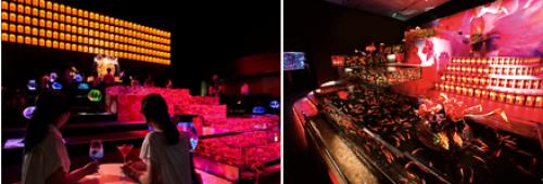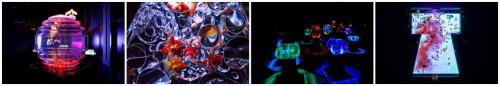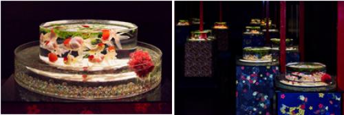 作品以日本江户时代的“花魁”命名。近千条金鱼汇聚其中,全力游向顶端,如同花魁一般,绽放出夺目的光芒,成为全场的焦点。 此外还有使用透明多面体打造棱镜效果的作品“晶彩棱镜”,让金鱼在雪洞光影中游弋的作品“雪洞梦境”和透过凹凸镜可以看到金鱼的作品“凹凸世界”,以及将日本京都传统工艺品“京友禅”最高端的和服作为鱼缸的背景的“和服禅境”等共计15组新奇有趣的作品。