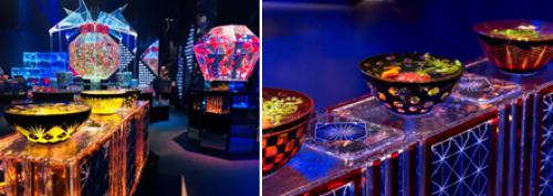 新旧艺术相融合的作品,上方为日本江户切子雕花风格的亚克力金鱼台盆,下方为江户切子工艺的玻璃鱼缸。在绚美的灯光下,不同的切割面呈现出不可思议的观赏效果,绽放出特有的艳丽色彩。 行灯魅影