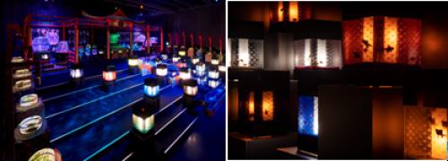 以日本传统照明灯具“行灯”为主题的作品。金鱼在光影交织中来回穿梭,透过侧面的蕾丝花纹观赏,若隐若现,充满梦幻色彩。 华鱼缭乱