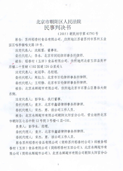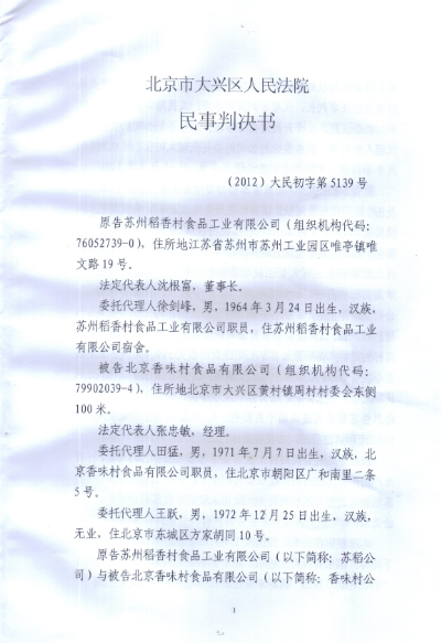 2012年,苏稻起诉澳门稻香村侵权,北京市大兴区人民法院认为苏稻拥有“稻香村”商标专用权,认定澳门稻香村侵权,判决澳门稻香村停止侵权行为,并登报启事消除影响,同时赔偿苏稻20万元经济损失。