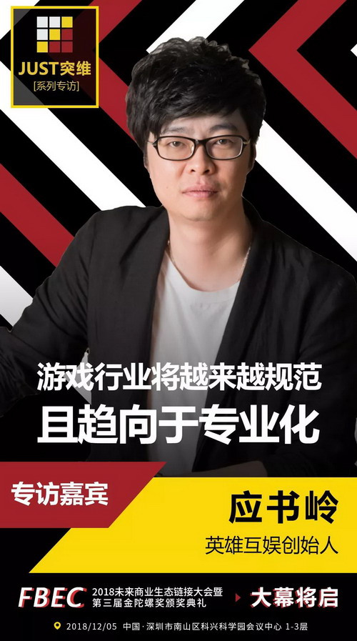 由深圳市互联网文化市场协会、广东省游戏产业协会指导,游戏陀螺、陀螺财经、正中企业服务联合主办的2018未来商业生态链接大会暨第三届金陀螺奖颁奖盛典(简称“FBEC2018”)将于2018年12月5日在深圳市南山区科兴科学园会议中心1-3层举办,本届大会以“突维 · 新裂变”为主题,涵盖游戏及数字娱乐、区块链技术应用、VR/AR/AI等多个行业。 针对大会,游戏陀螺推出《Just突维》栏目,邀请业内的重磅人物,一起来探讨今年游戏业的突维。本期我们邀请到英雄互娱创始人应书岭。