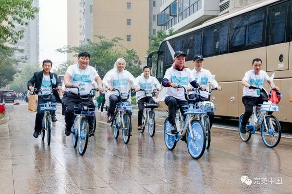 仪式结束后,古润金董事长率领完美伙伴一同骑行。当日阴雨绵绵,但古董事长对健康的追求和对公益的执着温暖着所有伙伴! 骑行是一种健康自然的运动方式,代表着挑战自我的生活态度和追逐梦想的激情活力。古董事长说:“我已经很多年没有骑过单车,但为了这次活动,特意重新学习了骑车,感觉自己都年轻许多,这是一项很有意义的健康运动。”